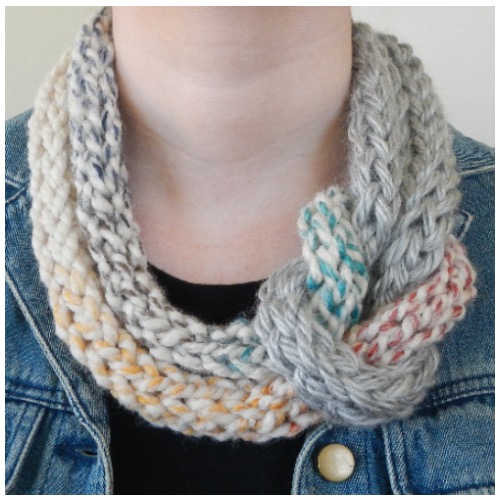 2. Tie each knit cord into a loop. Intertwine the loops as shown and pull ends to tighten.