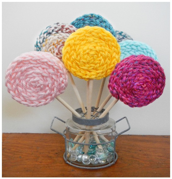 2. Roll knit cord into a spiral using glue dots or hot glue to hold the shape in place. Trim off yarn ends. Click on above photo for a tutorial on sewing the spirals for small lollipops.