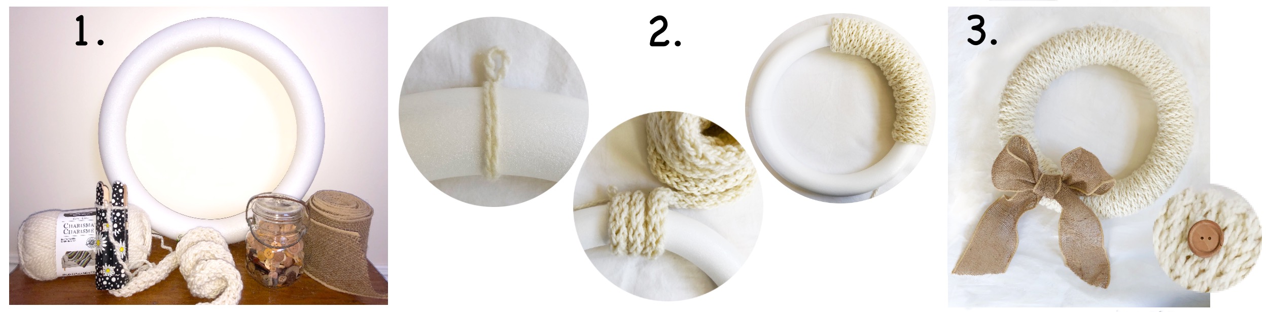 1. Knit two thick cords of differing lengths (knit cords in photos are about 24 inches and 34 inches long).